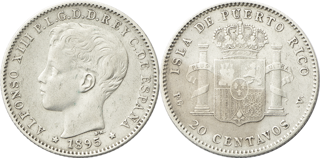 ALFONSO XIII. 20 Ctvos de Peso. Ag. 4,97 gr. 1895. Puerto Rico. AC-126. MBC/MBC+.