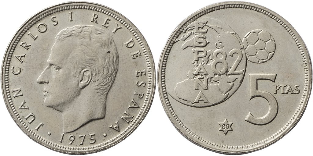 JUAN CARLOS I. 5 Pesetas. Cu/Ni. 5,72 gr. 1875 * 80. Madrid. AC-40. Error del Mundial. Escasa. S/C-.
