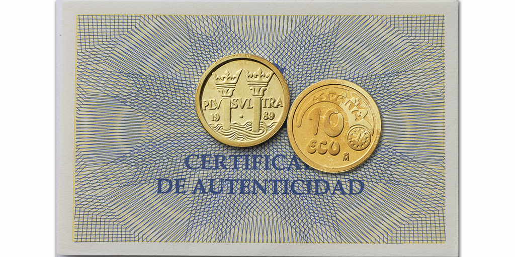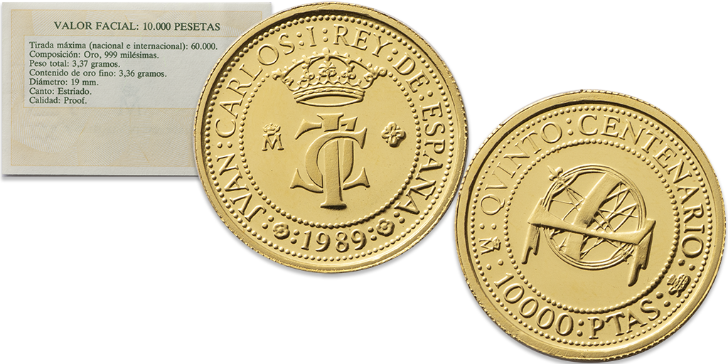 JUAN CARLOS I. 10.000 Pesetas. Au. 3,35 gr. 1989. Esfera armilar. Con certificado. FDC.