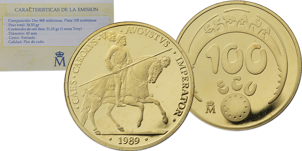 JUAN CARLOS I. 100 Ecu - 1 Onza. Au. 34,57 gr. Ger-608. Carlos V. Con certificado. Proof.