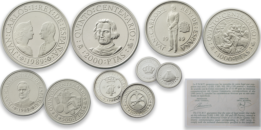 JUAN CARLOS I. Serie de 5 piezas de 100 a 2.000 Pts. Ag. 51,79 gr. 1989. I serie V Cent. Con certificado. FDC brillo.