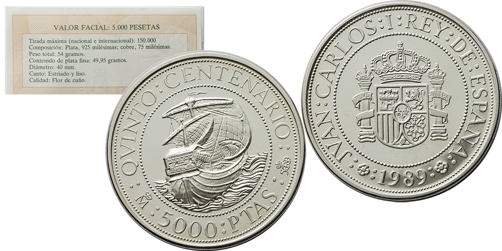 JUAN CARLOS I. 5.000 Pesetas. Ag. 54 gr. 1989. I serie V Cent. Con certificado. FDC.