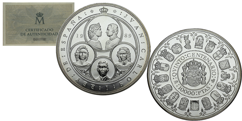 JUAN CARLOS I. 10.000 Pesetas. Ag. 168,76 gr. 1989. I serie V Cent. Con certificado. FDC.