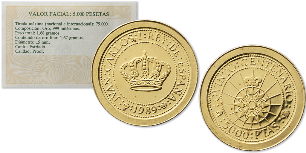 JUAN CARLOS I. 5.000 Pesetas. Au. 1,69 gr. 1989. Rosa de los vientos. Con certificado. Proof.
