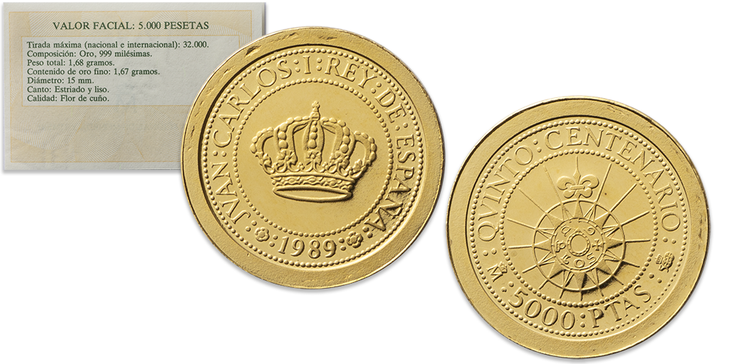 JUAN CARLOS I. 5.000 Pesetas. 1989. Au. 1,66 gr. Rosa de los vientos. Con certificado. FDC.