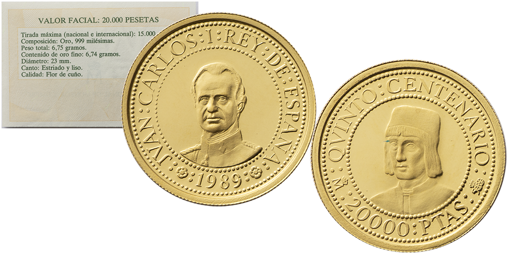 JUAN CARLOS I. 20.000 Pesetas. Au. 6,67 gr. 1989 gr. Pinzón. Con certificado. FDC.