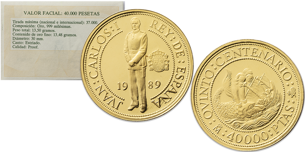 JUAN CARLOS I. 40.000 Pesetas. Au. 13,59 gr. 1989. Mar tenebroso. Con certificado. Proof.