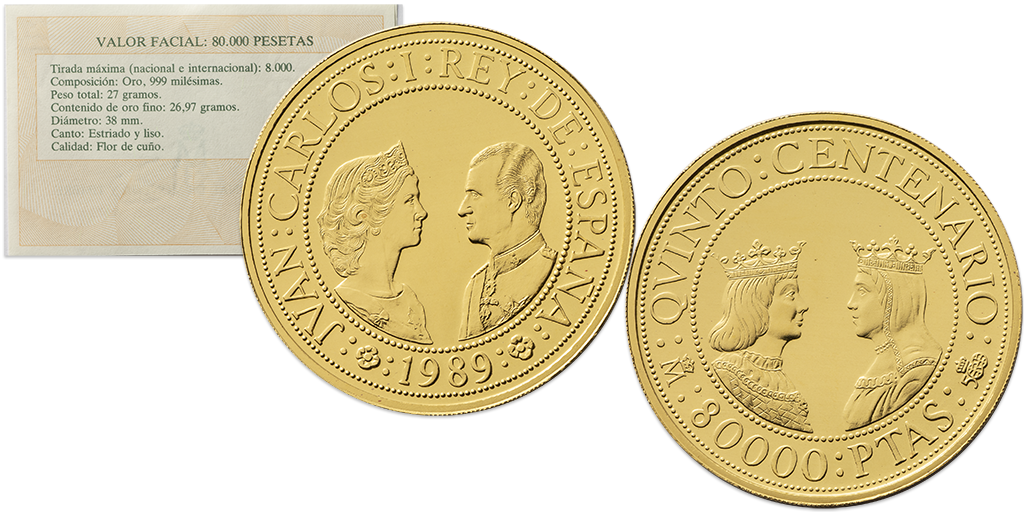 JUAN CARLOS I. 80.000 Pesetas. Au. 26,86 gr. 1989. Reyes católicos. Con certificado. FDC.