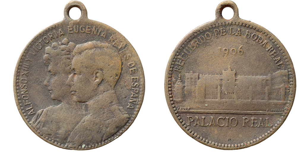 MEDALLA. Alfonso XII. Recuerdo de la Boda Rral. Cu. 3,43 gr. 22 mm. 1906. Con asa. A/ Alfonso XII y Mª Eugenia. R/ Palacío Real. MBC/MBC+.