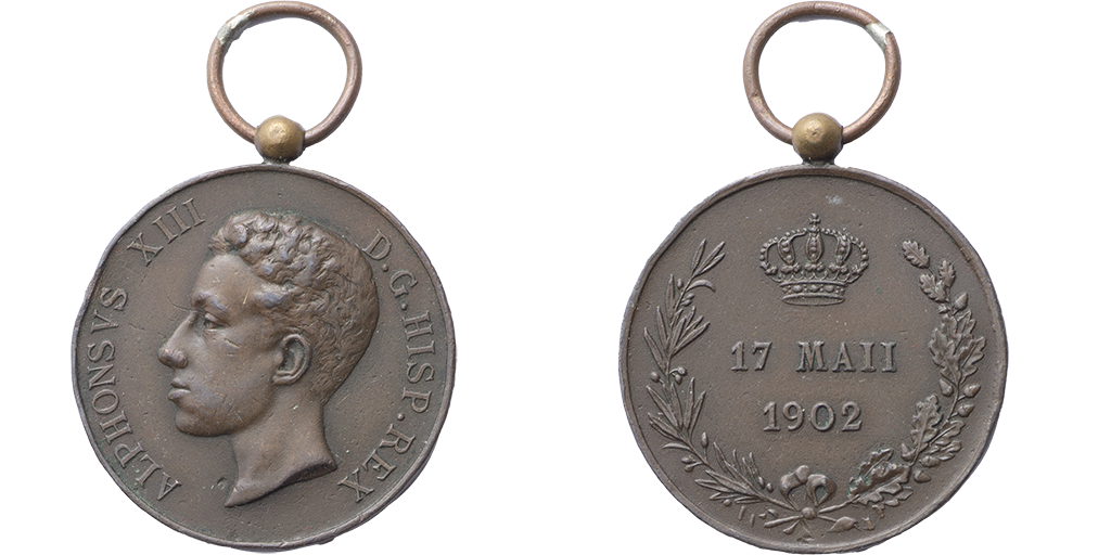 MEDALLA. Alfonso XIII. Jura de la Constitución. Cu. 12,50 gr. 31 mm. 17 de Mayo de 1902. Con asa y reasa. Lig. golpecitos en canto. EBC.