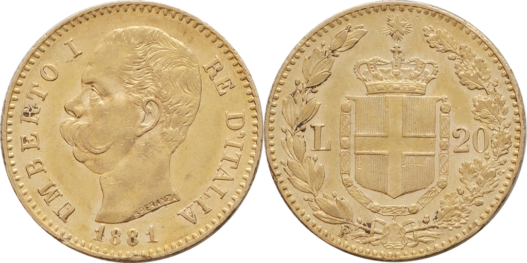 Italia. 20 Liras. Au.6,21 gr. 1881. R. Km-21. Humberto I. EBC.