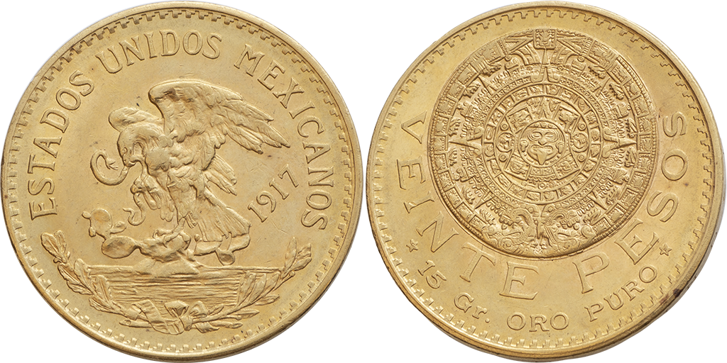 México. 20 Pesos. Au. 16,71 gr. 1917. Km-478. Calendario Azteca. S/C-.