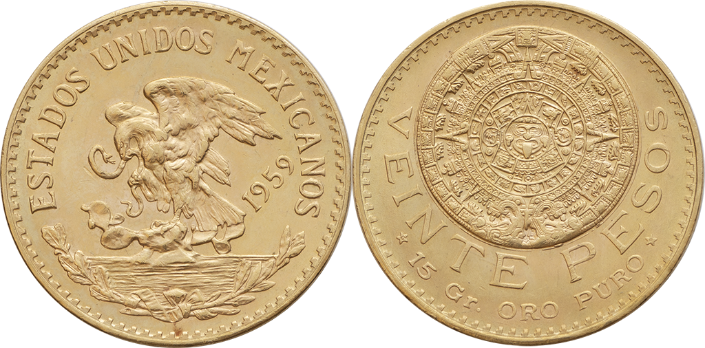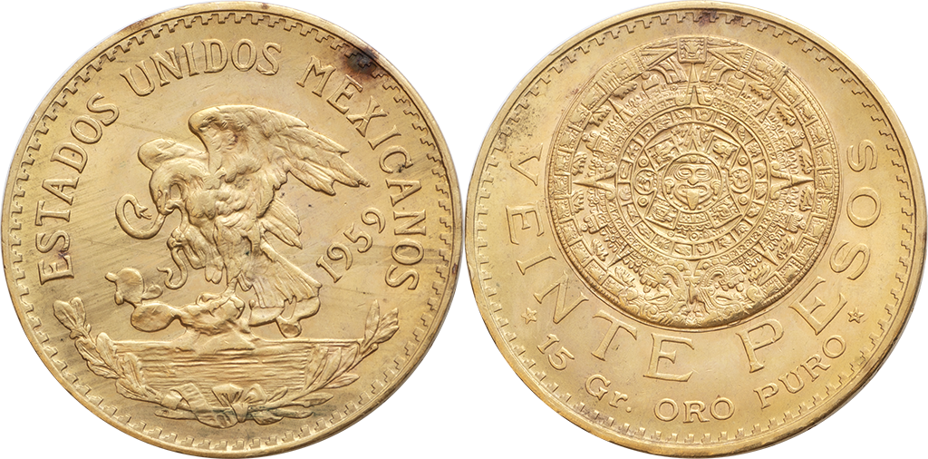 México. 20 Pesos. Au. 16,63 gr. 1959. Km-478. Calendario Azteca. S/C.