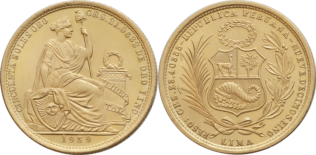 Perú. 50 Soles. Au. 23,38 gr. 1959. Km-230. Escasa. S/C.