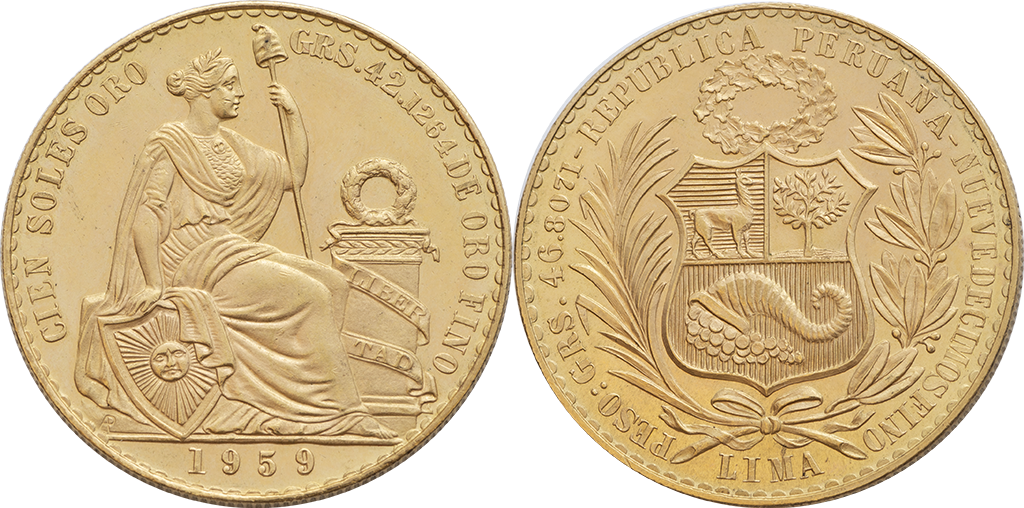 Perú. 100 Soles. Au. 46,80 gr. 1959. Km-231. Escasa. S/C-.