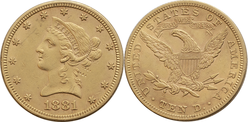 U S A. 10 Dólares. Au. 16,72 gr. 1881. Km-102. Coronet. EBC-/MBC+.