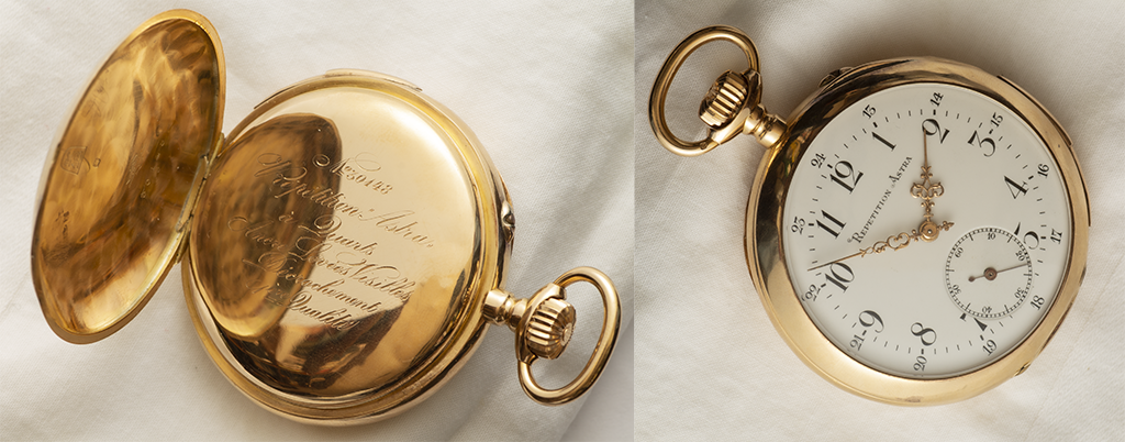 Reloj de oro de 18 k. "Repetition Astra". Corona. Sonería a cuartos. Dos tapas. En perfecto funcionamiento. Esfera con números arábigos. N 30148