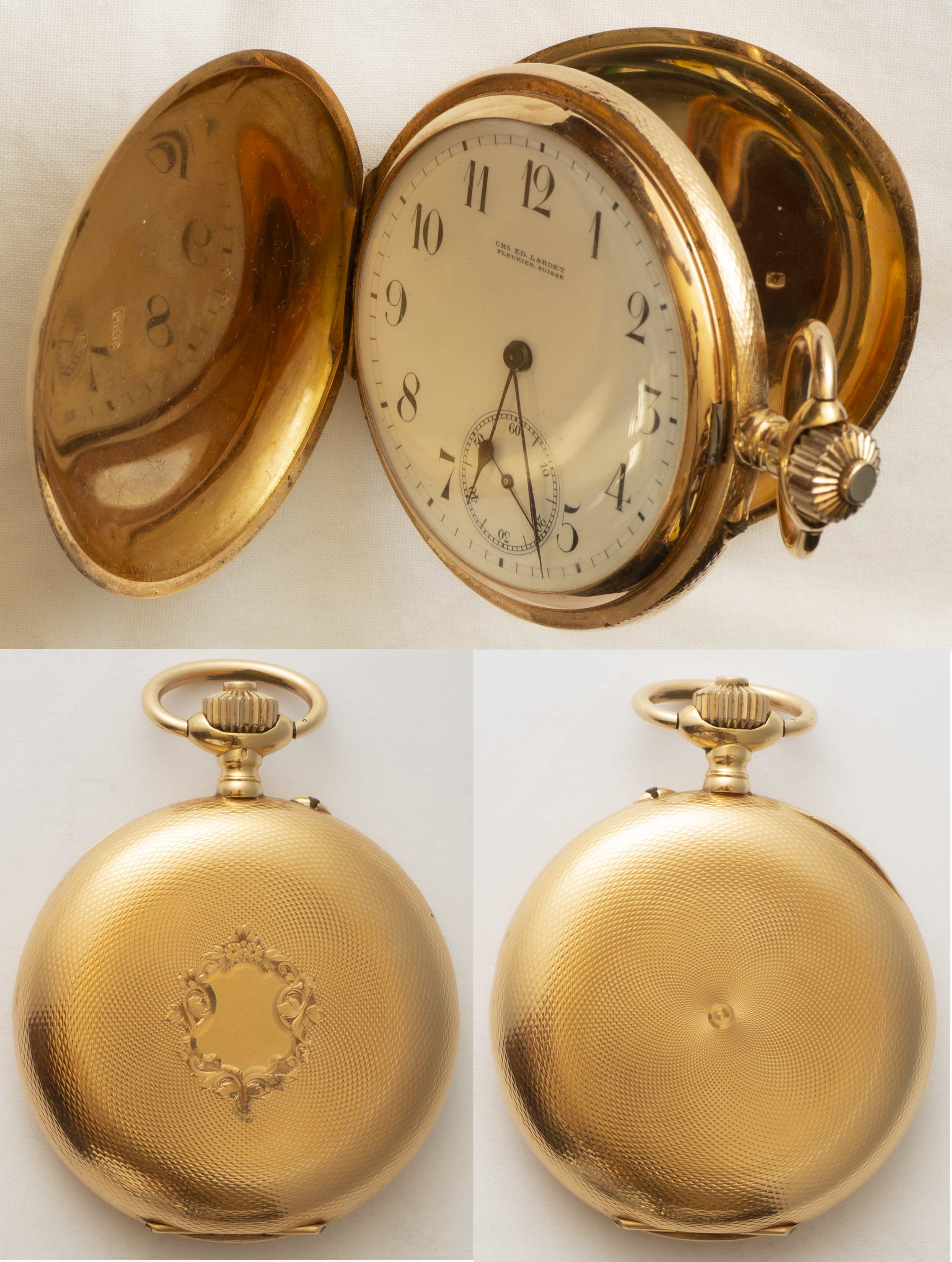 Reloj de oro de 18 k. "CHARLES EDWARD LARDET FLEURIER". Saboneta (3 tapas). En perfecto funcionamiento. Esfera con números arábigos. Corona. N 32865
