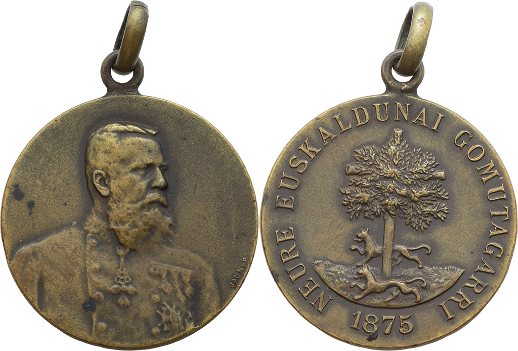Carlos VII. "Juramento de Don Carlos". Cu. 1875. 30mm. Guerra-1051b. A/ Busto de Carlos VII. R/ Escudo de Vizcaya. "Neure Euskaldonai Gomutagarri". Con asa y reasa. EBC.