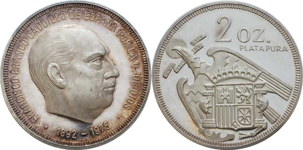 Estado Español. Medalla de 2 Onzas. Ag pura. 1975. R/ Moneda de 5 Pesetas. Proof.