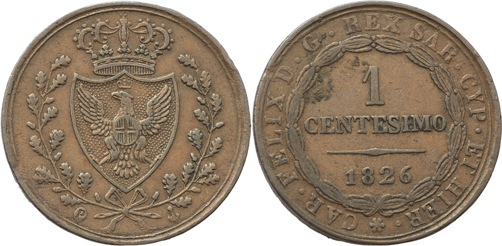 Italia. CERDEÑA. 1 Centesimo. Cu. 1826. Km-125. MBC+. Salida: 12,00€