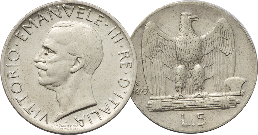 ITALIA. LOte de 2 piezas de 5 Liras. Ag. 1929 *FERT* y **FERT**. KM-67.1 y 67.2. MBC+. Salida: 16,00€