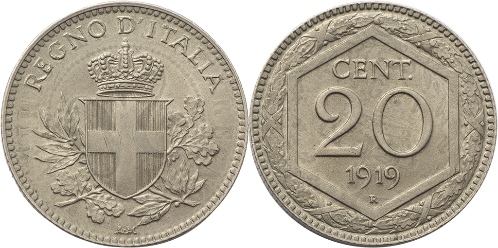 Italia. 20 Centesimi. Cu/Ni. 1919. R. Km-58. Restos del B. O. S/C.