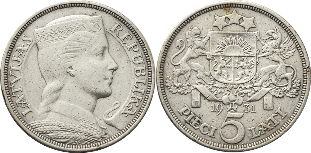 LETONIA. 5 Lati. Ag. 1931. Km-9. EBC.