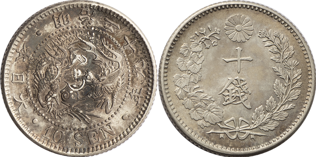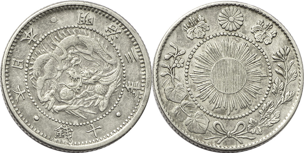 JAPON. 10 Sen. Ag. Año 3. (1870). Y-2. Escamas poco profundas. Escasa. EBC. Salida: 35,00€